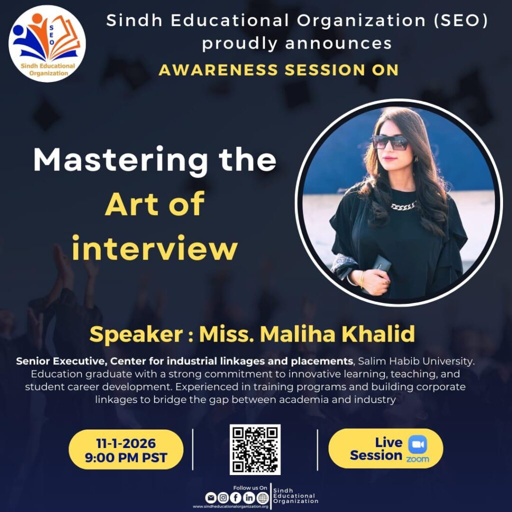 Sindh Educational Organization (SEO) proudly announces a professional development session entitled “Mastering the Art of Interview”, featuring Miss Maliha Khalid, Senior Executive, Center for Industrial Linkages and Placements, Salim Habib University. Miss Khalid specializes in innovative learning, teaching, and student career advancement.