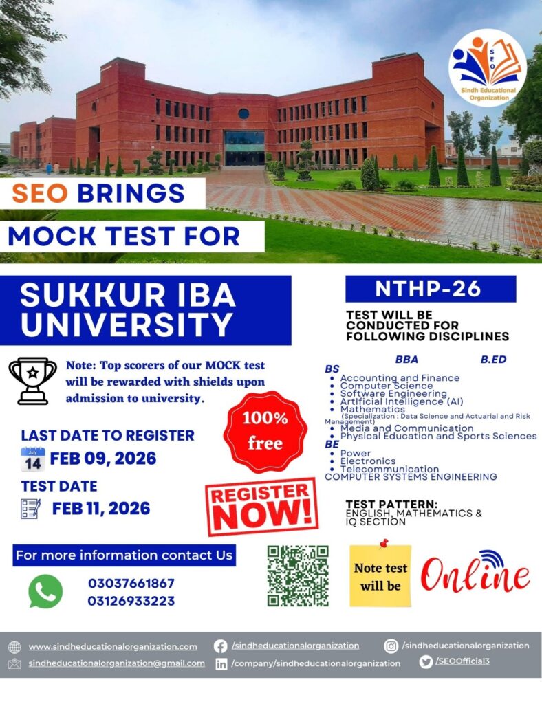 The Sindh Educational Organization (SEO) is pleased to announce a free online mock test for students preparing for the Sukkur IBA University NTHP 2026 test. This initiative aims to support aspiring candidates by helping them assess their preparation, improve test-taking skills, and gain confidence ahead of the actual examination.